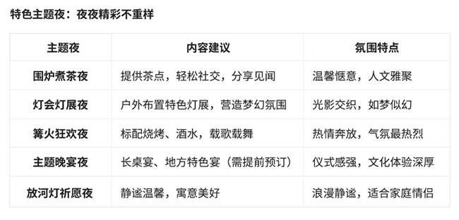 活动安排同样精彩。篝火晚会配备场地、组织人员以及基础饮品,游客能在月色下围着篝火载歌载舞,感受节日的欢乐氛围;围炉煮茶体验提供茶、点心和场地,让游客在茶香中放松身心;山庄徒步导览有专业向导服务,带领游客探索山庄周边的自然美景。此外,景区往返接送服务为游客出行提供便利,特色伴手礼则鼓励游客好评及自媒体传播。“5天4晚”套餐在住宿时长增加的同时,还增添了接站服务、观音堂游览、更多特色正餐以及山庄内丰富多样的体验活动,满足游客深度度假的需求。